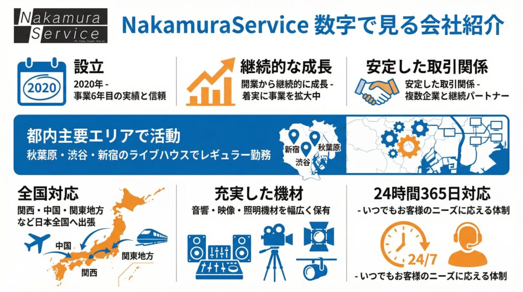 NakamuraServiceは2020年の設立以来、音響・映像・照明技術のプロフェッショナルとして、着実に成長を続けてきました。